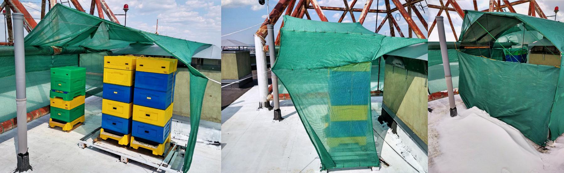 - to ensure the protection of bees from excessive temperatures (up to 65 °C in the sun), it is recommended to arrange a tent, made of a shading net over the hives. Setting up the tent (see the attached picture) allows you to reduce the temperature on the surface of the hives by 15-20 °C in the summer and increase the temperature on the surface of the hives by 10 °C in the winter, and also protects bee colonies from strong gusts of wind;