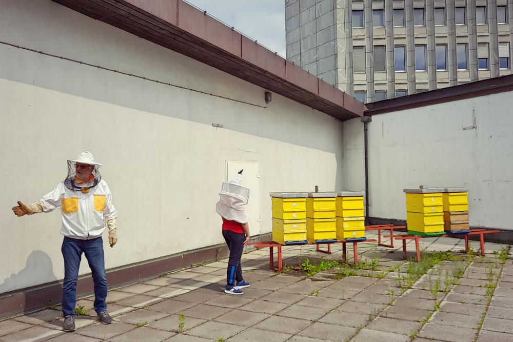 Skrbnik panjev na terasi CD in pionir modernega urbanega čebelarjenja v Ljubljani Franc Petrovčič je otrokom in mladostnikom predstavil sestavne dele panja in osnovna orodja, temelje biologije čebelje družine, v manjših skupinicah pa so se zvrstili tudi pri ogledu samih panjev s čebelami.