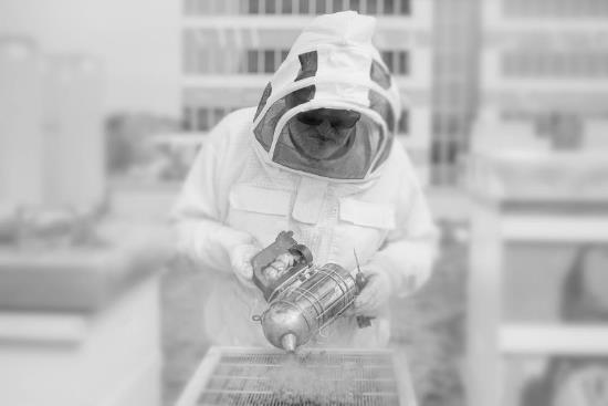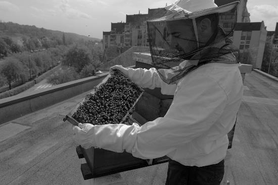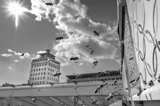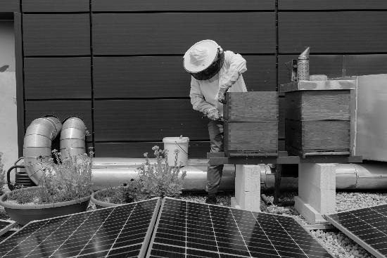 Fotografija dela s čebelami v panjih na strehi poslovne stavbe, kjer si prostor delijo s sončnimi paneli za pridobivanje električne energije in povečanje samopreskrbne zmogljvosti stavbe je nastala kot del serije, ki jo je Ciril Jazbec zgodaj jeseni 2023 posnel za odmeven članek v časopisu The New York Times.
