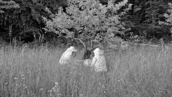 Sredi junija 2023 smo prejeli klic, da se na Rakovniku nahaja roj čebel neznanega lastnika. Za dva člana društva Urbani čebelar, Marka in Gorazda, je bil to že tretji klic "na pomoč" v mestu tisti dan in čeprav so bile čebele na lokaciji ovite okrog debla manjše jablane, smo jih uspeli brez težav rešiti v celoti in jim omogočiti novo, varno domovanje. Klicatelj je medtem z distance naredil nekaj bukoličnih fotografij, ki spominjajo na slikarstvo Moneta ali - zakaj pa ne - na slovenske impresioniste. Čista idila tik ob centru Ljubljane!