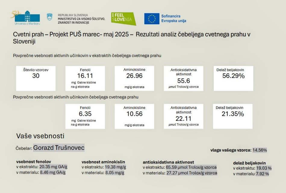 Študentke in študentje Fakultete za kemijo in kemijsko tehnologijo Univerze v Mariboru so spomladi leta 2025 izvajali analizo svežega cvetnega prahu, ki so ga nabrale čebele; med 30 vzorci iz različnih lokacij po Sloveniji (iz vseh statističnih regij) smo jim za ta namen dostavili tudi sredi maja 2025 odvzet vzorec iz ekološko certificiranega čebelarstva na sedežu društva Urbani čebelar v Ljubljani (Bežigrad).