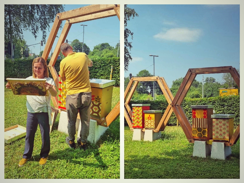 Stojišče z nakladnimi panji, ki so ga za naš projekt "Medena celica" zasnovale/i študentke/i Fakultete za dizajn (mentorici dr. Jasna Hrovatin in Nataša Šušteršič Plotajs) je dobilo svoj par v gaju pred Ministrstvom za zunanje in evropske zadeve. MZEZ je zelo aktivno v okviru svoje "čebelje diplomacije" in po svetu podpira številne projekte, ki krepijo družbeno in okoljsko odpornost.